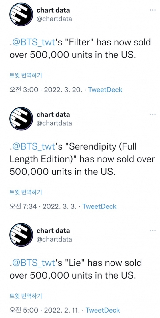 이는 앞서 2월 11일 지민의 솔로곡 '라이'(Lie)와 3월 3일 '세렌디피티 풀랭스'(Serendipity Full Length Edition)가 차례로 50만 유닛이 판매된 이후 또 다시 기록을 세운 것이다.