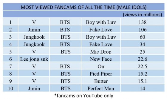 최근 해외 미디어들은 2022년 3월 21일 기준으로 유튜브에서 역대 가장 많이 본 남녀 아이돌, 각각의 '직캠 톱10'을 선정했다.