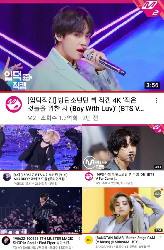 '남자아이돌 직캠 톱10'에서 1위를 차지한 것은 뷔의 직캠으로 현재 1억 3880만 뷰를 기록하고 있는 Mnet의 입덕직캠 '작은 것들을 위한 시'다. 이어 뷔는 마이크드랍 직캠이 5위에 올랐으며 7위에서 9위까지 ON, PiedPiper, 버터 순으로 차지해 '톱10'의 직캠 중 무려 50%가 뷔의 직캠이다.