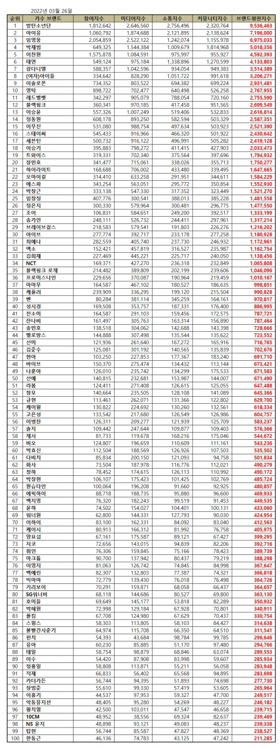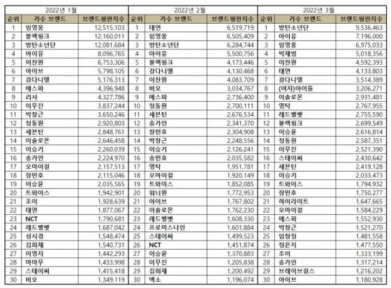 2022년 3월 가수 브랜드평판 30위 순위는 방탄소년단, 아이유, 임영웅, 박재범, 이찬원, 태연, 강다니엘, (여자)아이들, 이솔로몬, 영탁, 레드벨벳, 블랙핑크, 이승윤, 정동원, 이무진, 스테이씨, 세븐틴, 이승기, 트와이스, 장민호, 하이라이트, 오마이걸, 에스파, 박창근, 임창정, 정은지, 조이, 송가인, 브레이브걸스, 아이브 순으로 분석됐다.