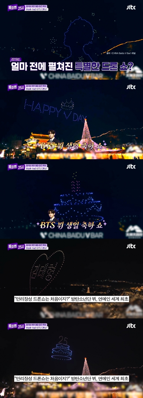 이날 방송에서는 지난 2019년 뷔의 중국 팬클럽 '바이두뷔바'가 뷔의 생일을 축하하며 연예인 세계 최초로 고북수진에서 펼친 드론쇼가 전파를 탔다.
