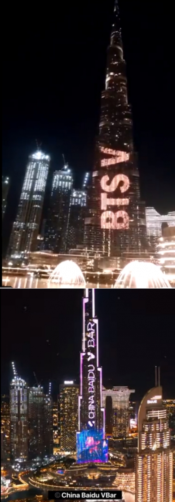 또 뷔는 한국 연예인 최초로 세계 최고층 두바이 부르즈 칼리파빌딩 조명쇼에 개인 생일광고를 내거는 레전드 서포트의 주인공으로도 스포트라이트를 받았다.