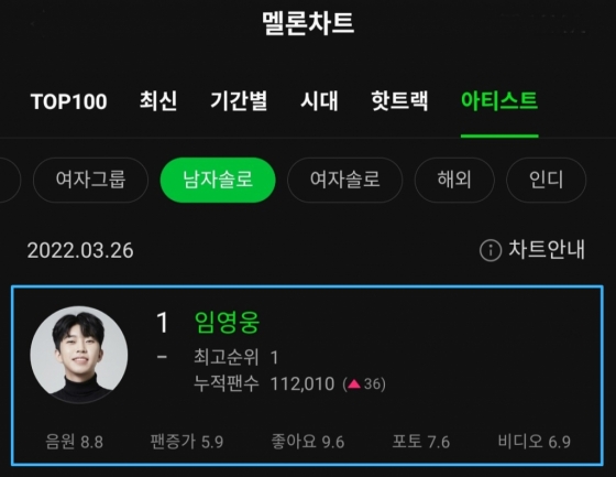 임영웅은 3월 26일 기준 멜론차트 아트스트 차트 남자솔로 1위를 기록했다.