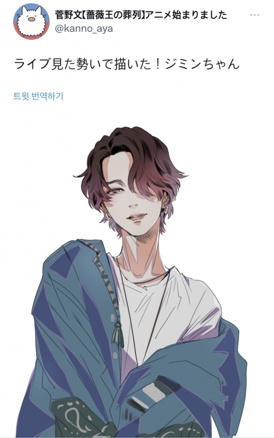 '장미왕의 장례 행렬'등으로 국내에도 잘알려진 일본 유명 만화작가 칸노 아야(Aya Kanno)는 자신의 트위터에 '콘서트때 지민의 모습을 그려봤어요'(ライブ見た勢いで描いた!ジミンちゃん) 라는 글과 함께 그림을 공개했다.