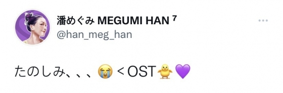 앞서 자신의 인스타그램에 지민의 노래와 사진, 그림, 타이니탄과 치미 굿즈 등으로 채우며 채워 애정을 한껏 드러내온 한 메구미는, 4월 9일 방영 예정인 tvN 드라마 '우리들의 블루스'에 지민의 첫 OST 참여 소식이 전해지자 자신의 트위터에 감격의 이모지와 함께 기쁨을 전했다.