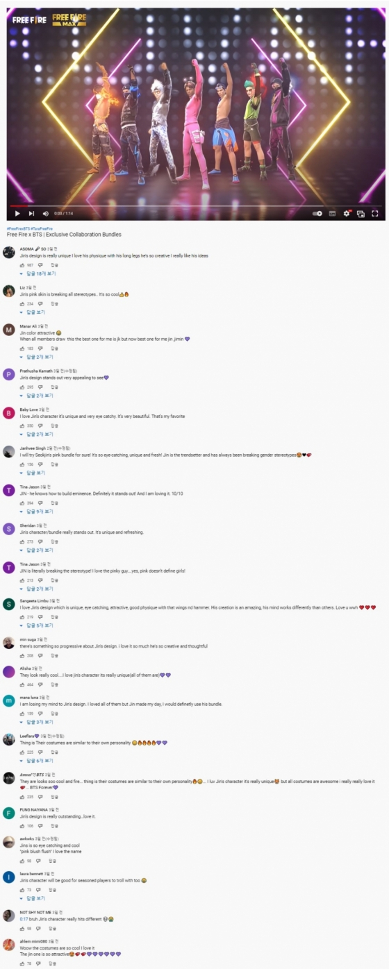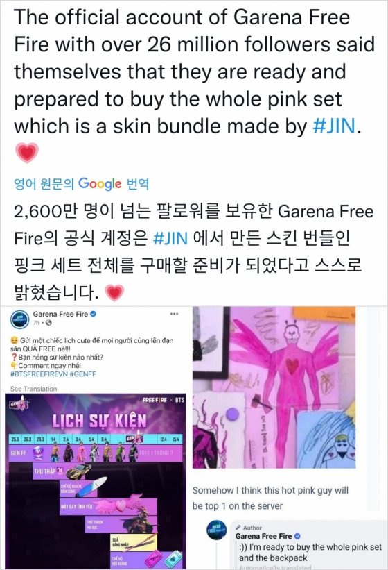 페이스북에 2600만 명이 넘는 게이머들로 구성된 '가레나 프리 파이어'라는 이름의 거대 커뮤니티 공식 계정은 진의 캐릭터를 본 후 핑크 번들 전체를 구매할 준비가 되었다는 댓글을 달았다.