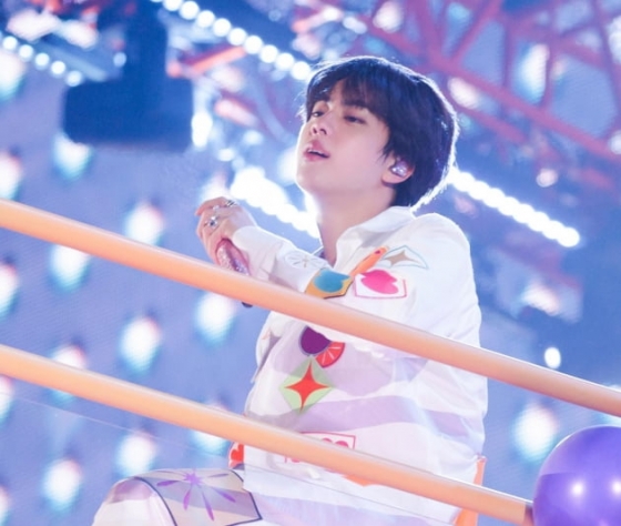 진은 밝은 핑크색 의상을 입고 가슴에 큰 하트를 한 채 예쁜 하트 모양의 배낭(날개)을 메기로 결정했다.