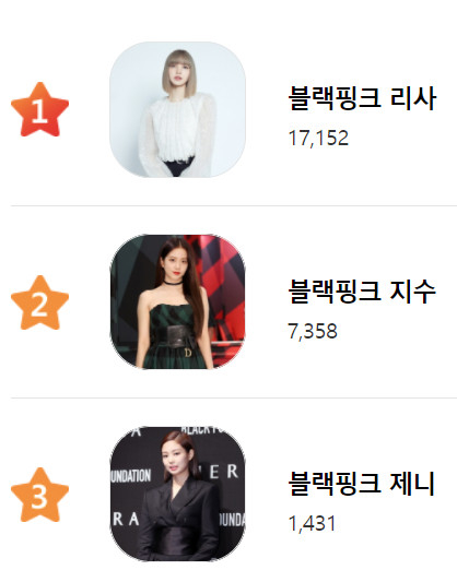 1위와 2위는 각각 블랙핑크 리사(17,152표), 지수(7,358표), 또 3위는 제니가 이름을 올려 블랙핑크 멤버들이 상위권을 전부 휩쓸었다. 4위는 에스파 윈터(687표), 5위는 에스파 카리나(602표)가 거머쥐었다.