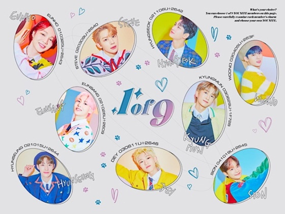 공개된 이미지에는 아홉 멤버들의 다채로운 이미지가 아기자기한 콜라주 형태로 디자인돼 있다. 멤버들은 컬러풀한 헤어와 화려한 패턴의 프레피룩으로 귀여운 매력을 뽐내고 있다. 가운데 적힌 '1 of 9'이란 폰트와 그 주위에 찍힌 귀여운 곰 발바닥 자국도 돋보인다.