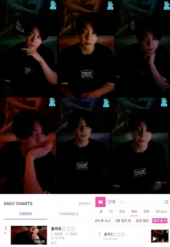 해당 정국의 '졸려요' 라이브 방송은 '브이라이브' 일간 차트 1위, 네이버 많이 본 '브이라이브' 랭킹 1위에 올랐다.
