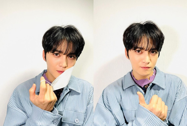 공개된 사진 속 김재중은 하늘색 재킷을 입고 마스크를 반쯤 벗긴 채 카메라를 응시하고 있다. 다른 사진에는 마스크를 완전히 벗은 김재중이 엄지손가락을 치켜 보이고 있다. 김재중의 잡티 하나 없는 맑은 피부가 눈길을 끈다.