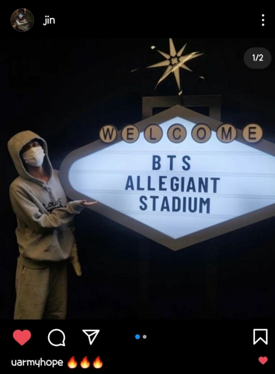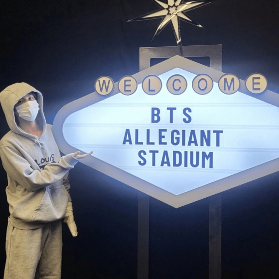 진은 "WELCOME. BTS ALLEGIANT STADIUM"이라고 쓰여진 커다란 간판을 오른손으로 가리키며 정면을 응시하고 있다.
