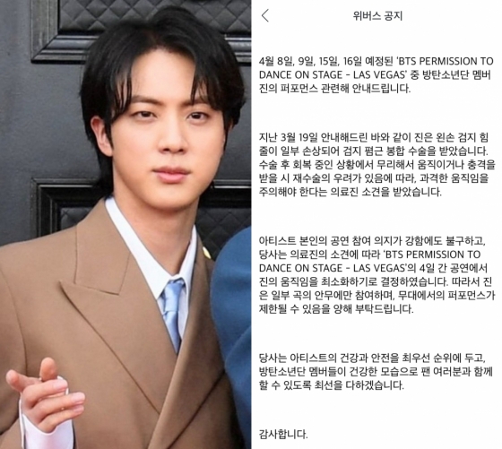 소속사는 "아티스트 본인의 공연 참여 의지가 강함에도 불구하고 의료진의 소견에 따라 4일 간 공연에서 진의 움직임을 최소화하기로 결정했다"며 "진은 일부 곡의 안무에만 참여하며, 무대에서의 퍼포먼스가 제한될 수 있음을 양해 부탁드린다"고 전했다.