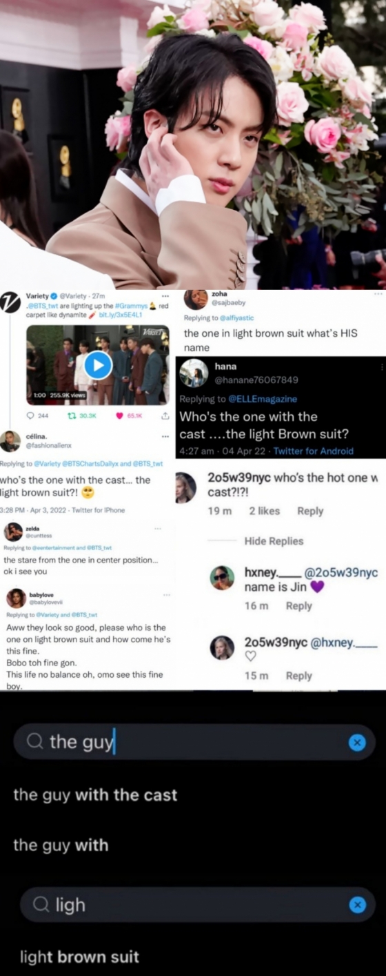진은 이번 그래미에서도 "Who is the guy in a light brown suit?"(밝은 갈색 옷 입은 남자가 누구인가?), "the guy with a cast"(깁스한 남자)라는 질문을 쏟아내게 만들어 '라이트 브라운 수트가이'(Light Brown Suit Guy)라는 별명을 얻었다.
