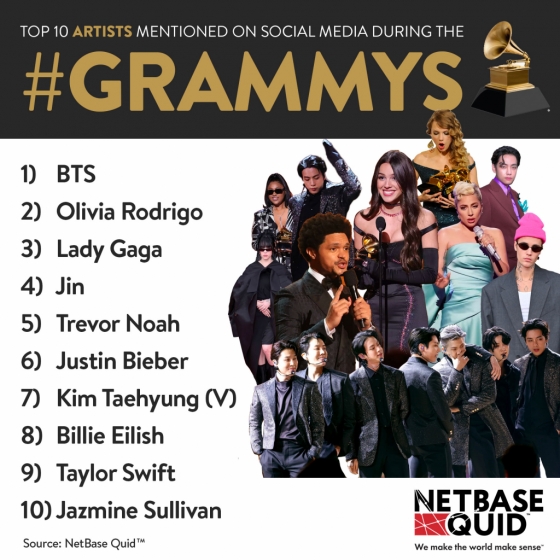 미국의 소셜미디어 분석 업계 선두 주자이자 소비자 시장정보 플랫폼 '넷베이스 퀴드(NetBase Quid)'에 따르면 진은 이번 그래미에서 전 세계 남자 개인 중 가장 많이 언급된 첫 번째 아티스트가 되기도 했다.