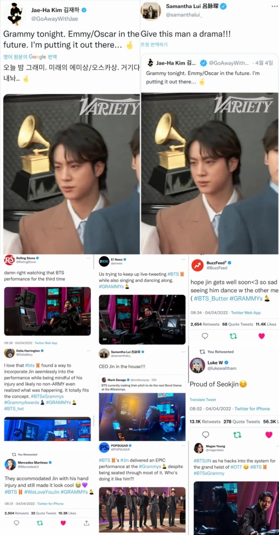 진은 수술을 받은지 얼마 안되지만 아무도 눈치채지 못할 정도로 환상적인 보컬과 우아한 퍼포먼스로 꿈 같은 무대를 선보이며 보는 이들을 열광하게 만들어 그래미를 뜨겁게 달궜다.