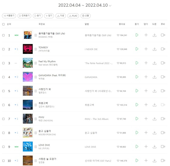 12일 멜론에 따르면 빅뱅의 신곡 '봄여름가을겨울' (Still Life)은 주간 차트에 1위에 오르며 여전한 인기를 입증했다.