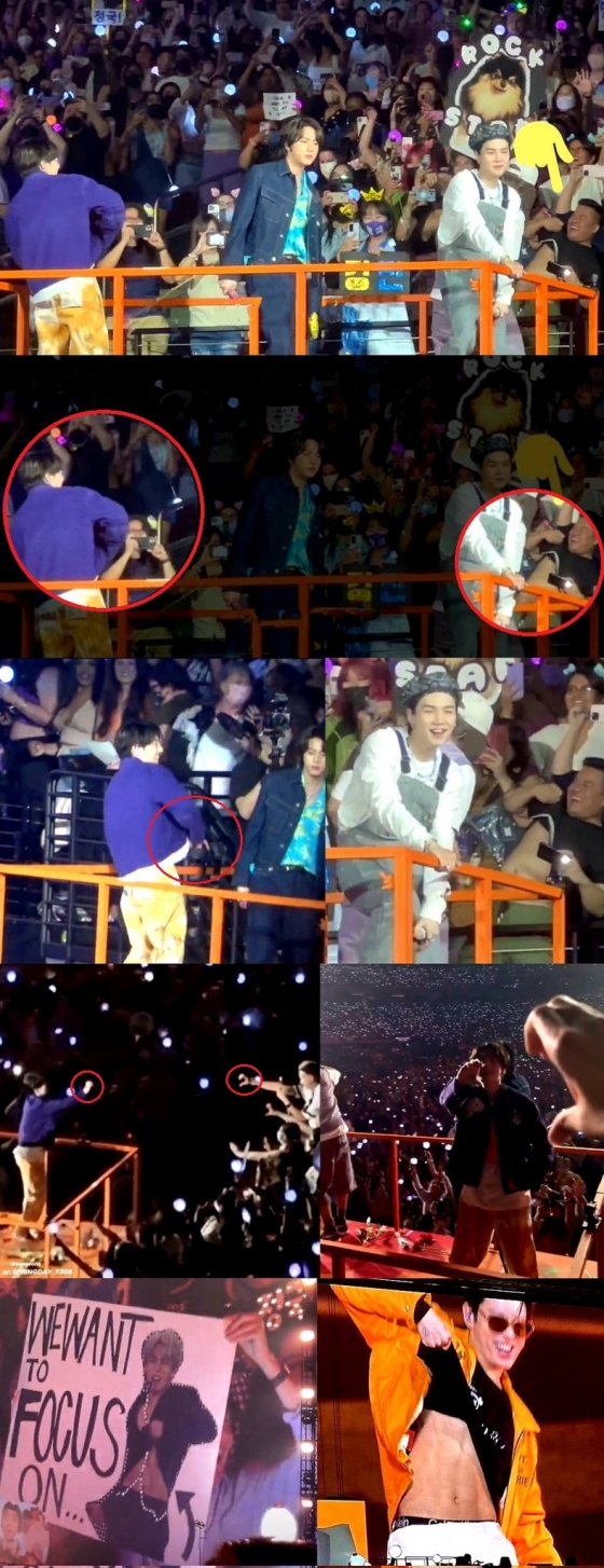 그러던 중 정국은 관객석에서 상의 티셔츠를 위로 올려 배를 드러낸 독특한 남자팬을 발견했다.