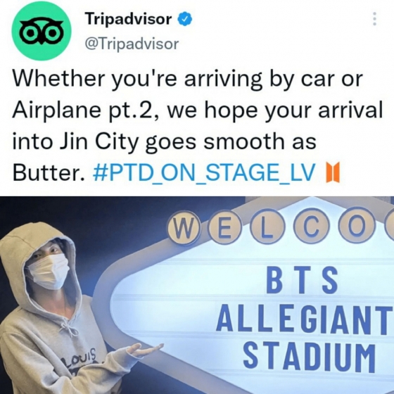 트립어드바이저도 "자동차로 오든 에어플레인 pt. 2로 오든 여러분의 '진 시티(Jin City)' 도착이 버터처럼 순조롭길 바란다"며 설렘과 기대감을 고조시켰다.