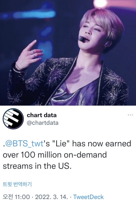 지민의 '라이'는 3월 14일 미국에서 방탄소년단 솔로곡 최초로 1억 회 이상의 온디맨드(On-demand, 주문형) 스트리밍을 달성하며 스테디 셀러로써 존재감을 자랑했다.