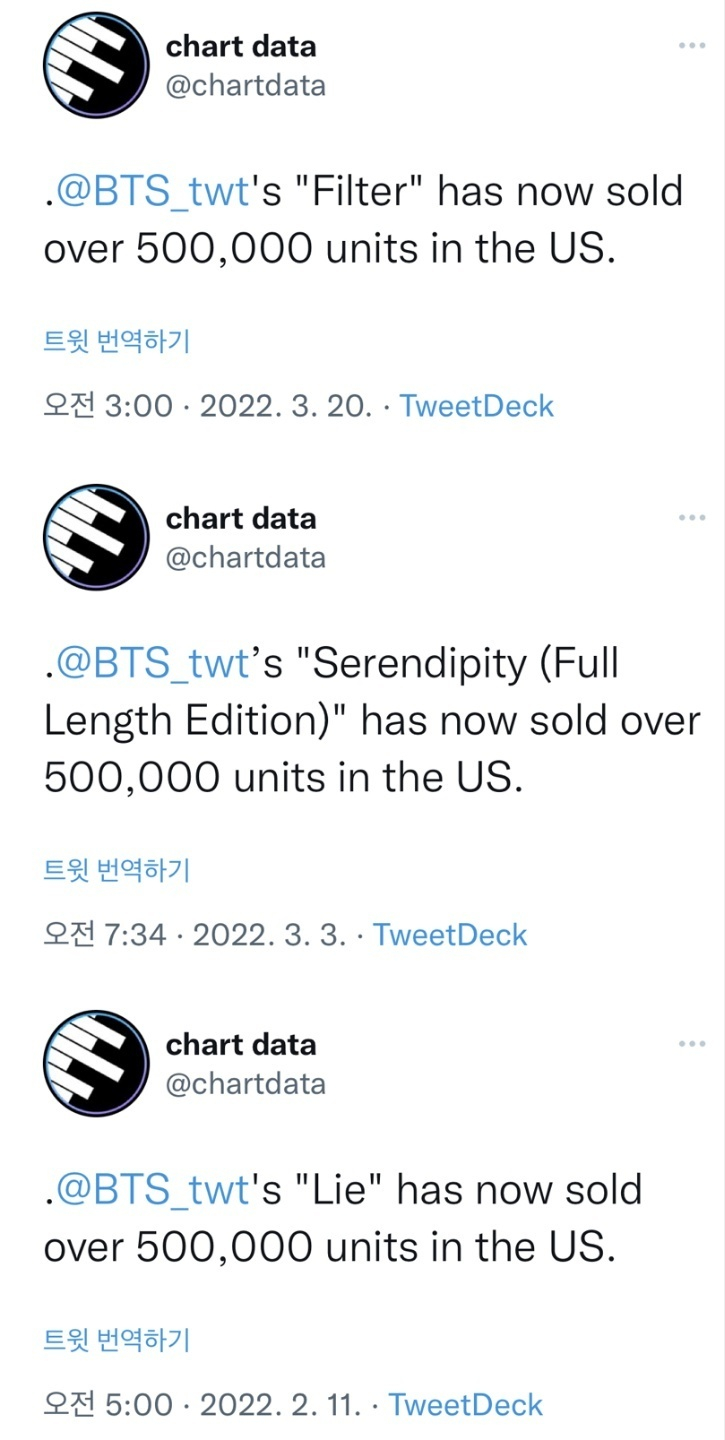 RIAA에서 골드 인증 자격을 받은 솔로 3곡을(라이, 세렌디피티 풀랭스, 필터) 보유한 한국 솔로 가수는 방탄소년단 지민이 최초이자 유일해 K팝을 대표하는 가수로서 그 의미가 매우 크다.