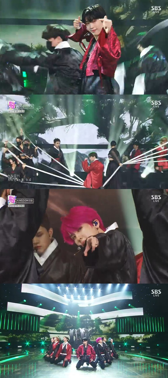 킹덤(자한, 아이반, 아서, 치우, 단, 루이, 무진)은 오늘(17일) 오후 3시 50분 방송한 SBS '인기가요'(이하 '인가')에 출연해 미니 4집 타이틀곡 '승천' 굿바이 무대를 꾸몄다.