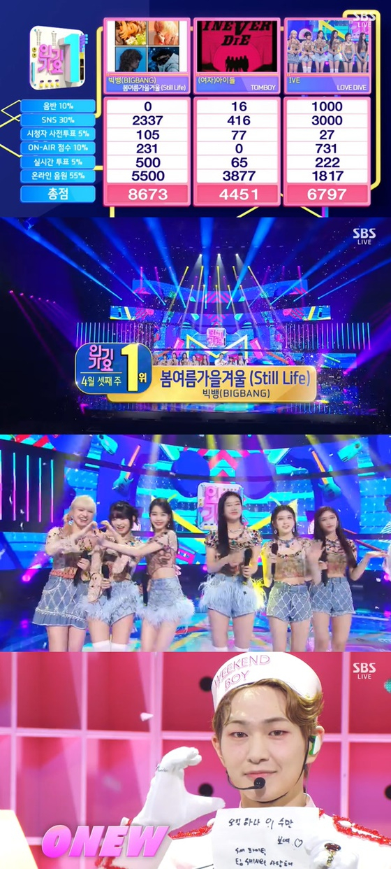 17일 방송된 SBS '인기가요'에서는 빅뱅 '봄여름가을겨울'이 (여자)아이들 '톰보이 (TOMBOY)', 아이브 '러브 다이브 (LOVE DIVE)'를 제치고 1위에 올랐다.