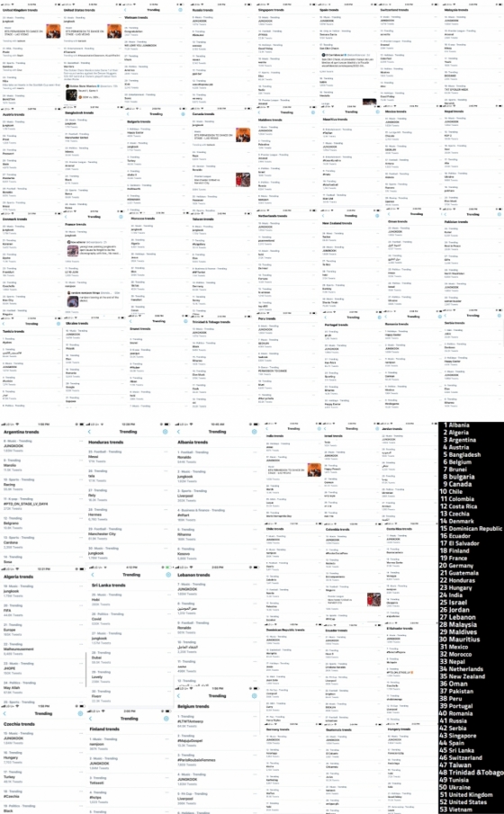 이와 함께 정국은 트위터에서 'Jungkook', 'JUNGKOOK' 등으로 53개 국가 실시간 트렌드에 올랐고 언급량 역시 최고 170만에 달하는 등 SNS에서의 뜨거운 반응을 나타냈다.