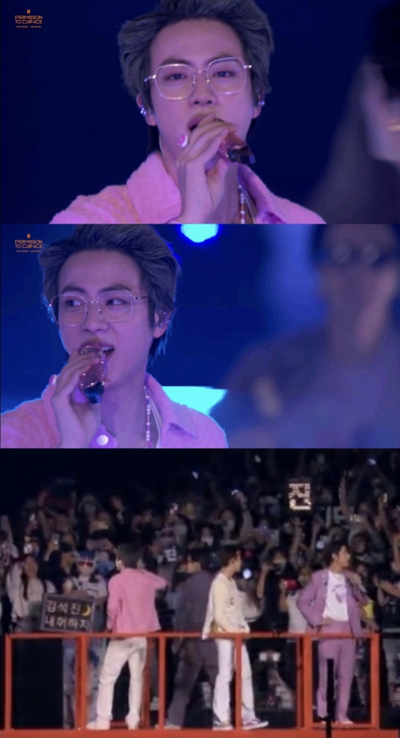 진은 핑크색 의상과 함께 등장해 발랄한 분위기로 마지막 콘서트의 시간을 신나고 즐겁게 채웠다. '라이프 고스 온 (Life Goes On)', '작은 것들을 위한 시 (Boy With Luv)', '다이너마이트 (Dynamite)', '버터 (Butter)', '잠시', '윙스(Wings)'를 부르며 사진을 찍고, 에어건을 쏘기도 했다. 또 어디선가 가져온 안경을 쓰고 이동차를 타고 큰 무대를 휘젓는 등 행복한 축제의 시간 그 자체였다.