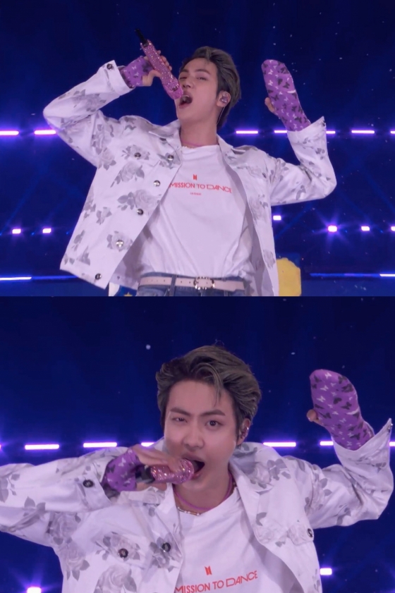 마지막 공연이었던 4회차에서 진은 애쉬그레이 칼라로 염색된 헤어로 강렬한 카리스마를 내뿜으며 'ON', '불타오르네', '쩔어', 'DNA'로 시작하는 무대를 열었다.