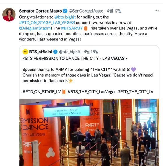 민주당 소속의 캐서린 코르테즈 매스토(Catherine Cortez Masto) 상원의원은 18일 트위터에서 방탄소년단 공식 계정을 게시물을 리트윗하며 "얼리전트 스타디움에서 2주 연속 콘서트를 매진시킨 BTS에게 축하를 보낸다"고 적었다.