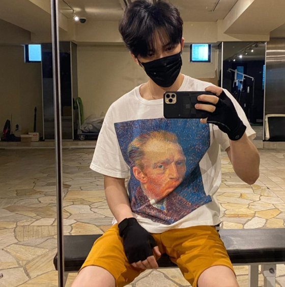 공개된 사진 속 김재중은 반고흐가 그려진 티셔츠를 입고 검정 마스크를 낀 채 거울 셀카를 찍고 있다.