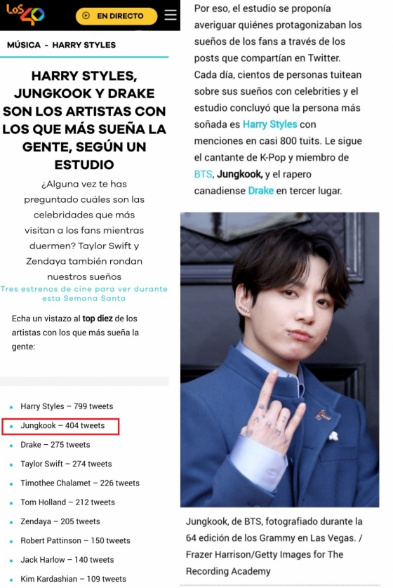 스페인 매체 'Los40'는 최근 '해리 스타일스, 정국, 드레이크는 사람들이 가장 꿈꾸고 싶은 아티스트'라는 기사를 전했다.