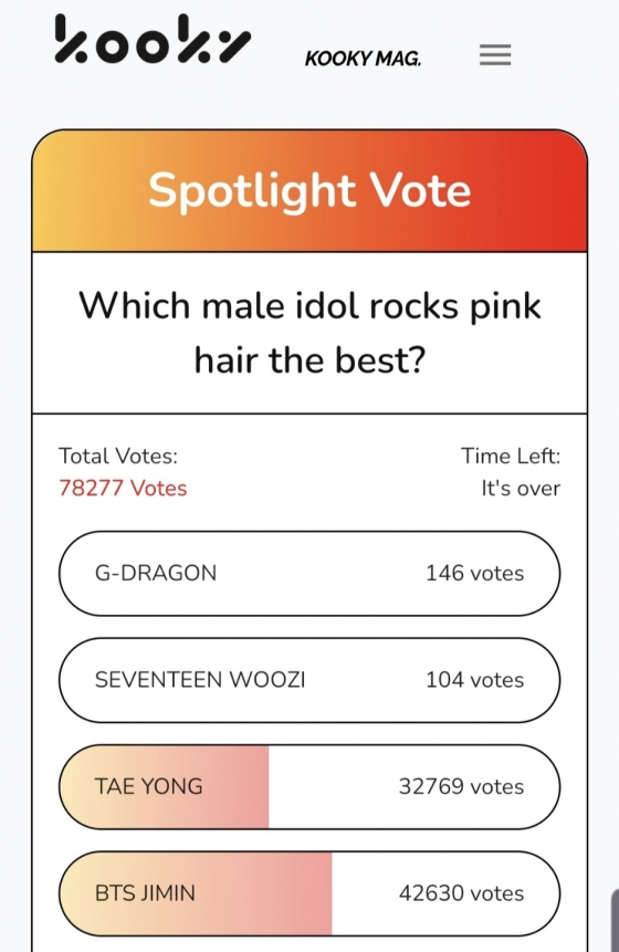 지민은 글로벌 K팝·K컬처 플랫폼 'Kooky'에서 진행한 '핑크색 헤어가 가장 잘 어울리는 남자 아이돌은?' 설문에서 총 7만 8277표 중 4만 2630표를 획득, 1위에 올랐다.