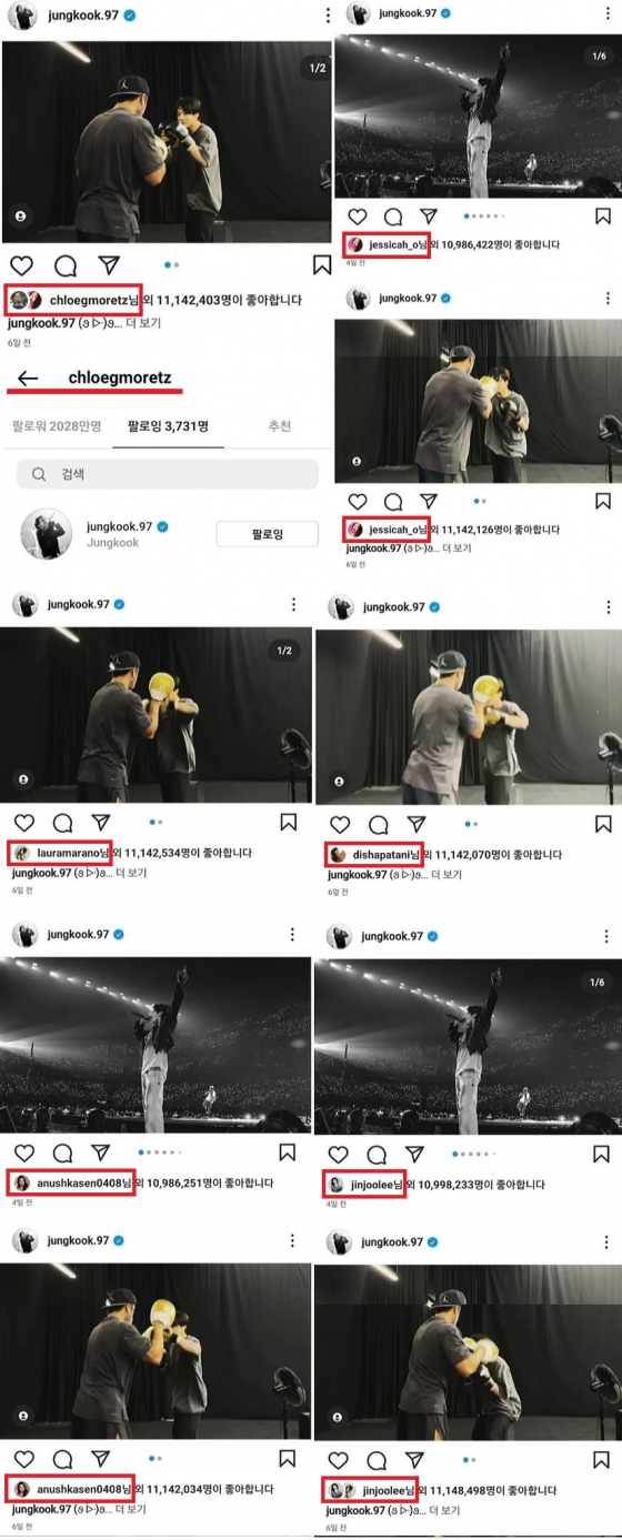 제시는 이외에도 정국의 또 다른 인스타그램 게시물에 '좋아요'를 꾹 누르며 남다른 애정을 보여줬다.