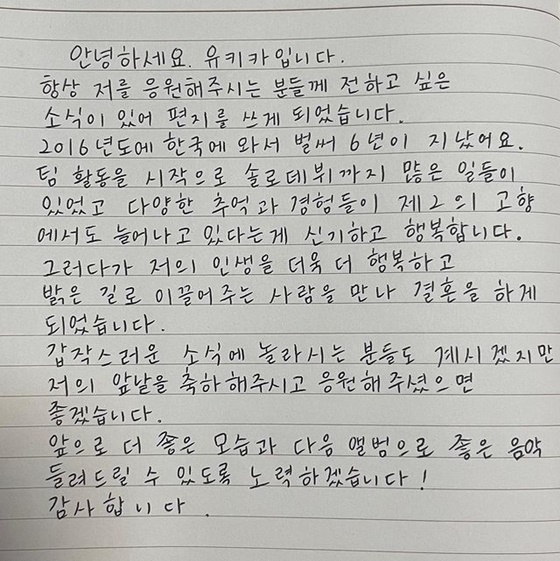 유카는 23일 개인 인스타그램에 자필 편지로 "제 인생을 더욱더 행복하고 밝은 길로 이끌어주는 사람을 만나 결혼하게 됐다"고 밝혔다.