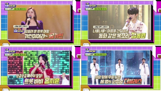 한편, 이날 방송되는 '더 트롯쇼'에는 송가인, 홍지윤, 정동원, 강진, 나상도, 더블레스, 두리, 한가빈, 해수가 함께 한다.