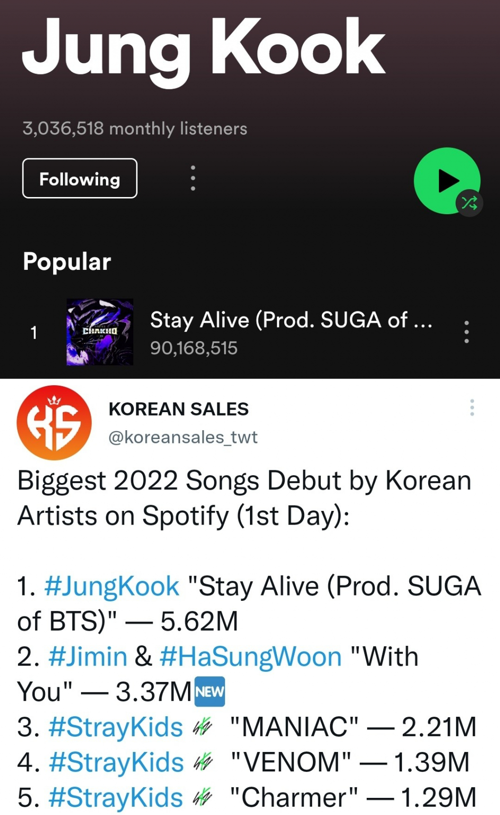 정국의 'Stay Alive'는 4월 26일(한국시간) 기준, 스포티파이에서 2022년 발매한 K팝 곡 전체 중 562만이라는 최다 데뷔 스트리밍 1위를 기록하기도 했다.