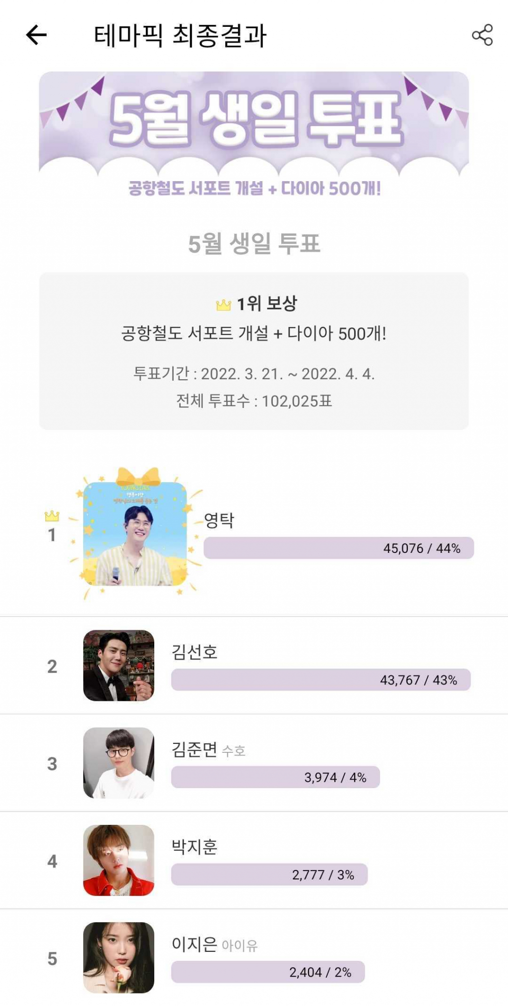 5월 8일 생일인 배우 김선호가 4만 3000표로 1위와 2천 표 차이로 아쉽게 2위를 달성했다. 이어 3위 김준면(엑소 수호), 4위 박지훈, 5위 이지은(아이유) 순으로 달성했다.