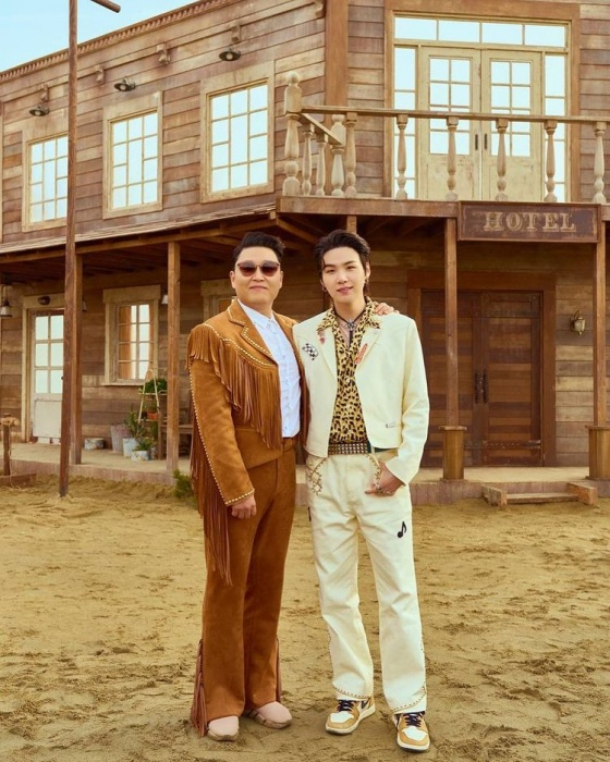 공개된 사진은 싸이의 신곡 'That That (prod. & ft. SUGA of BTS)' 뮤직비디오 촬영 현장에서 찍은 것으로 추정된다. 웨스턴 무드가 가득한 세트장을 배경으로 카우보이 복장을 한 싸이와 슈가의 모습이 담겼다. 두 사람의 비주얼 케미가 신곡에 대한 기대감을 높인다.