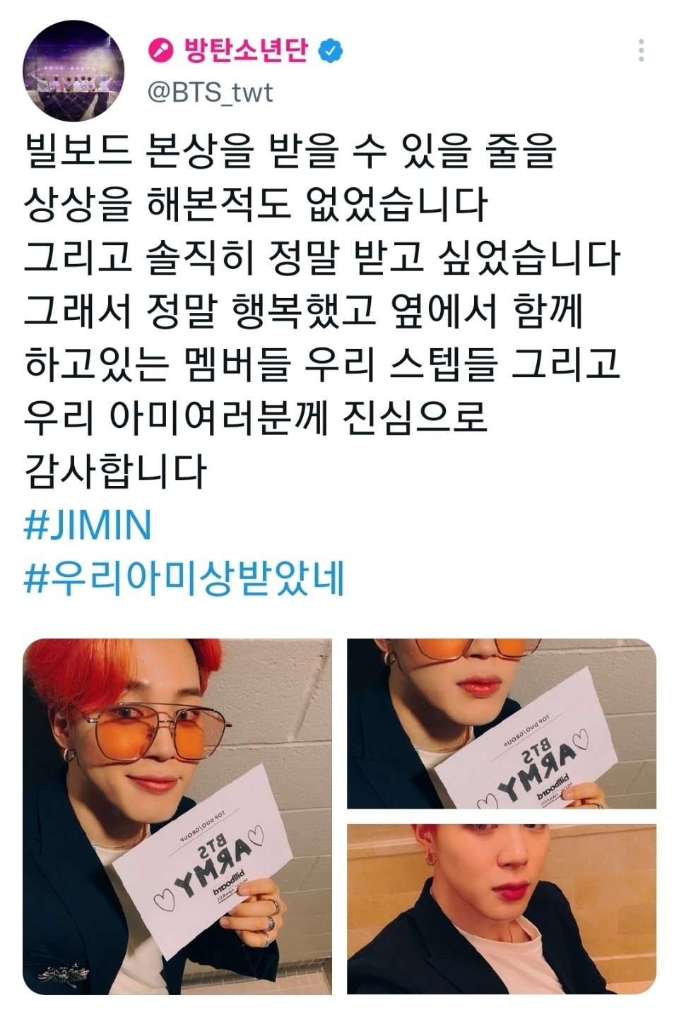 세계최대 음악 시상식의 권위와 위상을 상징하는 빌보드 뮤직어워드와 그래미 어워드에서 팀을 대표한 '방탄소년단 프론트맨'이자 '글로벌 잇보이'로서의 지민의 대단한 세계적 영향력이 앞으로 더욱 기대된다.