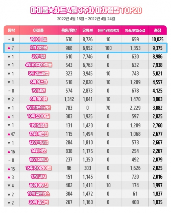 임영웅은 4월 3주차(4월 18일~4월 24일) 아이돌차트 아차랭킹 남자 솔로 1위를 기록했다.