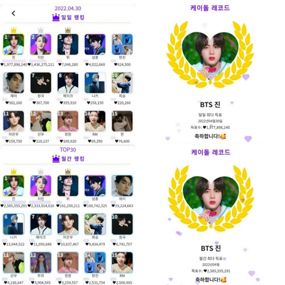 진은 지난 4월 17일에도 2억 2093만 5112개의 하트를 받아 일일랭킹 1위로 케이돌 레코드 달성, 4월11일부터 4월 17일까지 4억 2747만 1731개의 하트를 받아 주간랭킹에서 최다득표로 1위에 올라 케이돌 레코드를 달성했다.