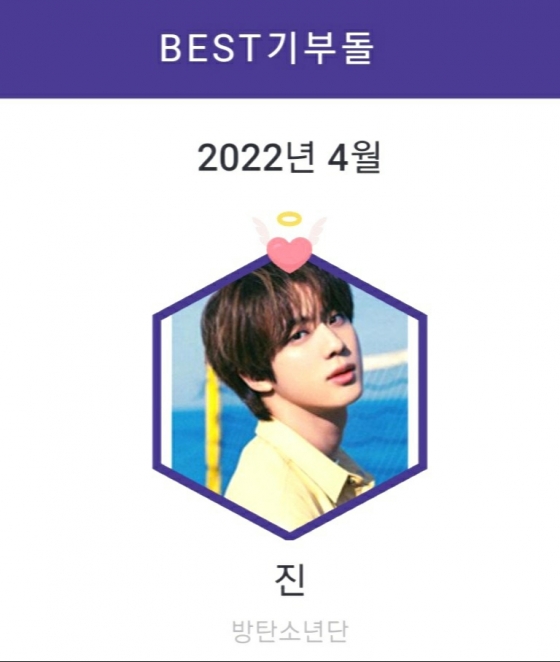 진은 베스트아이돌이 최근 발표한 4월 결산에서 'BEST 기부돌'에 올랐다. 진은 지난해 11월에 이어 또 다시 'BEST 기부돌' 영예를 안았다.