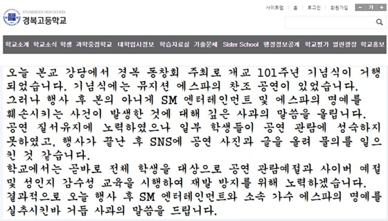 경복고 측은 2일 공식 홈페이지를 통해 개고 101주년 기념식에서 진행된 에스파 공연 관련 "행사 후 본의 아니게 SM엔터테인먼트 및 에스파의 명예를 훼손시키는 사건이 발생한 것에 대해 깊은 사과의 말씀을 올린다"며 사과했다.