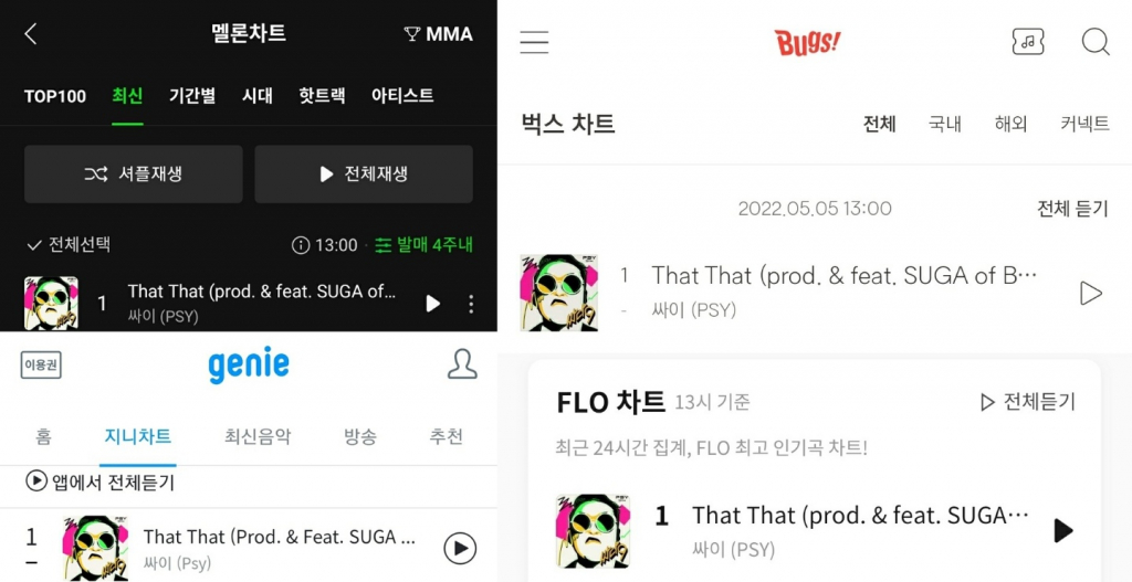 싸이의 정규 9집 '싸다9' 타이틀곡 'That That (prod. & feat. SUGA of BTS)'은 5일 오후 기준 지니, 벅스의 일간 차트와 FLO 24시간 차트, 멜론 발매 4주 내 최신 차트에서 1위를 달리고 있다.