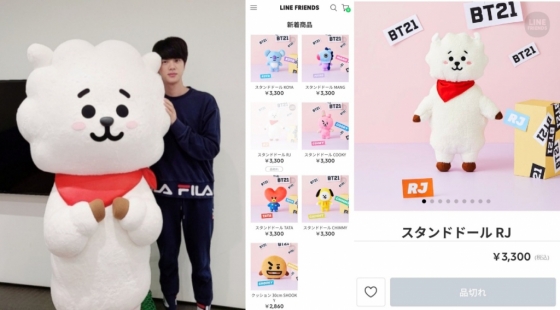 최근 일본 온라인 스토어 라인프렌즈 일본(LINE FRIENDS Japan)에 재입고 된 BT21 스탠딩 돌 인형 중 알제이(RJ)가 가장 먼저 품절, 폭발적 인기를 실감케 했다.