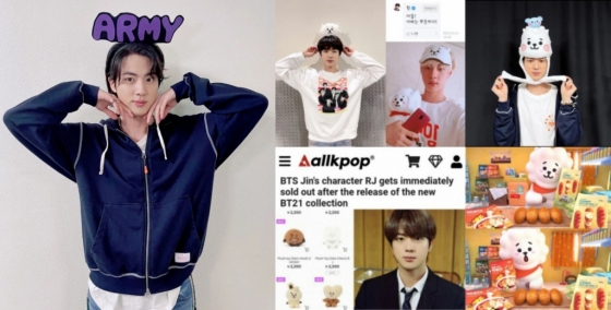 출시 때마다 알제이의 품절 대란이 이어지자 한 팬이 팬 커뮤니티 위버스에 글을 올리자 진은 "아들! 아빠는 뿌듯하다!"며 자랑스러워하는 모습을 보이기도 했다.