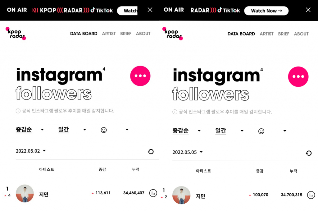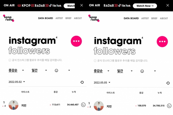 K팝 팬덤 데이터를 집계하는 스페이스 오디티의 케이팝 레이더에 따르면 지난 2일과 5일 하루 동안 지민의 개인 인스타그램이 10만 명 이상의 팔로워가 증가해 현재 3475만 팔로워를 돌파한 것으로 나타났다.