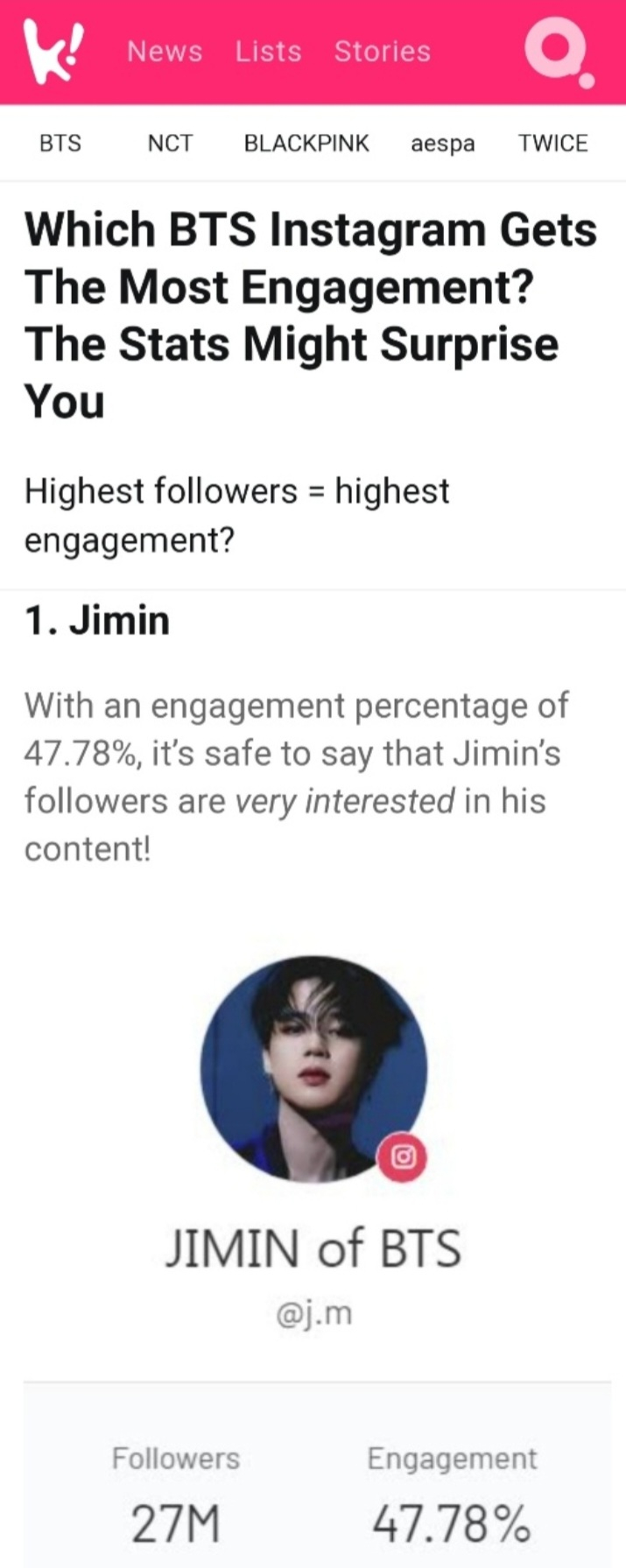 소셜 미디어 통계 사이트 'Socialtracker'의 참여율 분석결과 지민은 총 47.78%의 팔로워 참여율을 기록해 멤버중 1위에 오르며 독보적인 인기를 과시한바 있다.